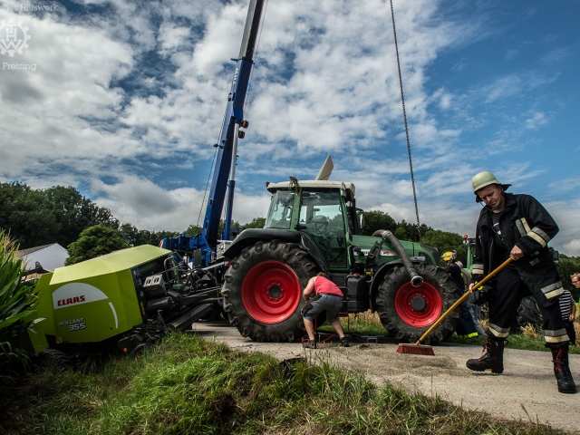Die Alarmierten Feuerwehren aus Wippenhausen, Zolling, Kranzberg und Haindlfing stellten die Erstversorgung des unverletzten Traktorfahrers sicher und fingen die aus dem Traktor auslaufenden Betriebsstoffe auf.