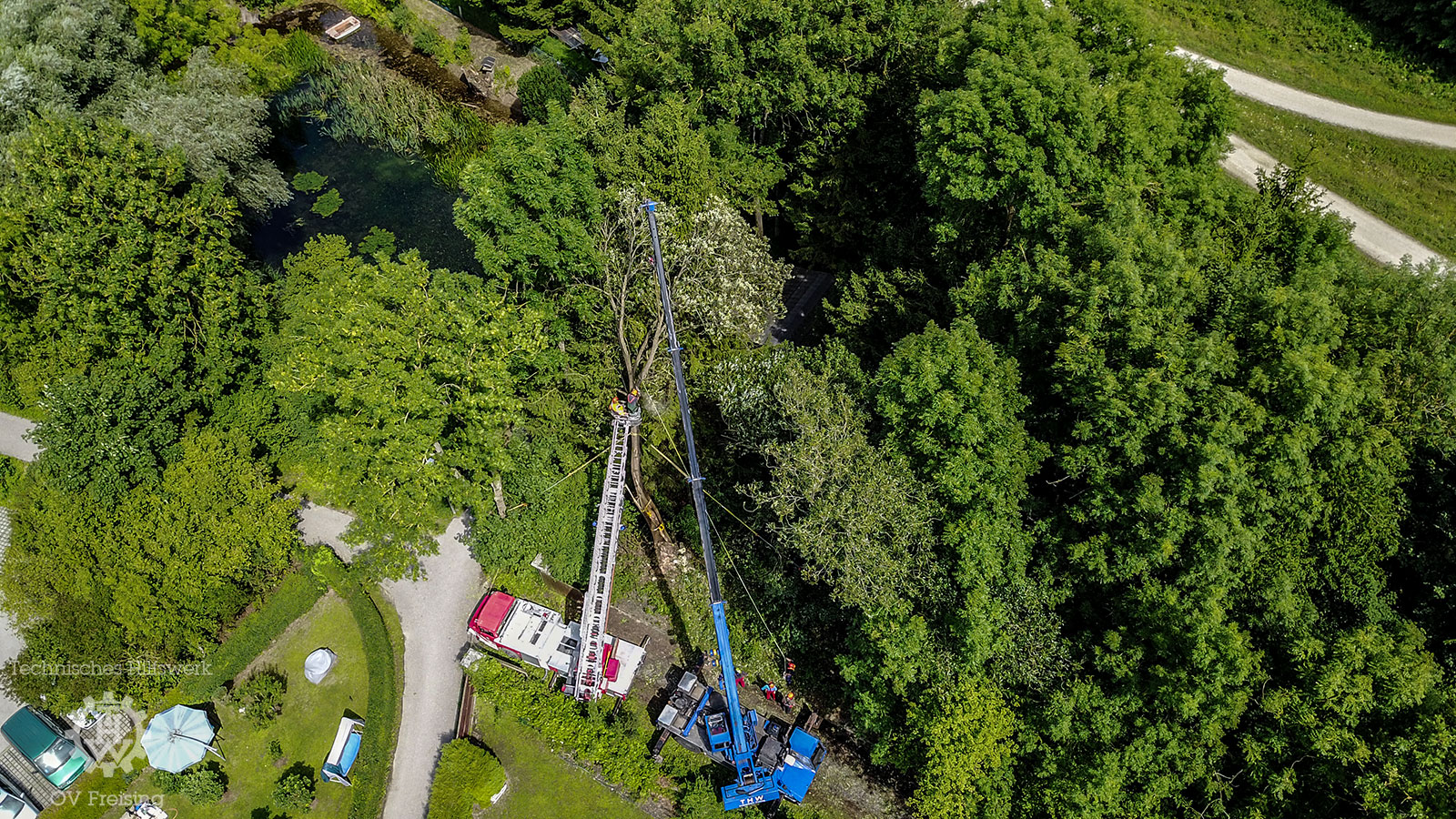 Mit der Unterstützung durch die Werkfeuerwehr Weihenstephan wurde der Baum, der sich im unteren Bereich gespalten und verdreht hatte, gefällt. Zum Einsatz kamen unter anderem die Drehleiter der Feuerwehr und der Mobilkran der Fachgruppe Brückenbau. Der gut 30 Meter hohe Baum wurde dabei in großen Stücken von oben abgetragen. Aus dem Korb der Drehleiter heraus wurde der Baum mit Anschlagmitteln am Kran angehängt und die Schnitte durchgeführt. Am Boden wurden die Abschnitte dann dann weiter zerlegt.