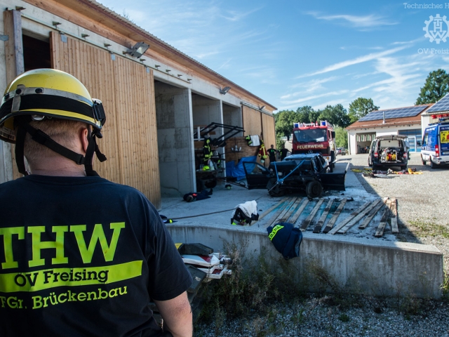 Die Helfer des THW Freisings unterstützten auch die Übungsvorbereitungen, indem sie mit Hilfe des Mobilkranes die Fahrzeuge abwarfen. So konnten die verschiedenen Unfallszenarien realitätsnah dargestellt werden.