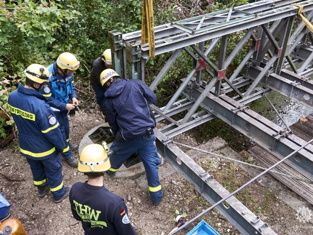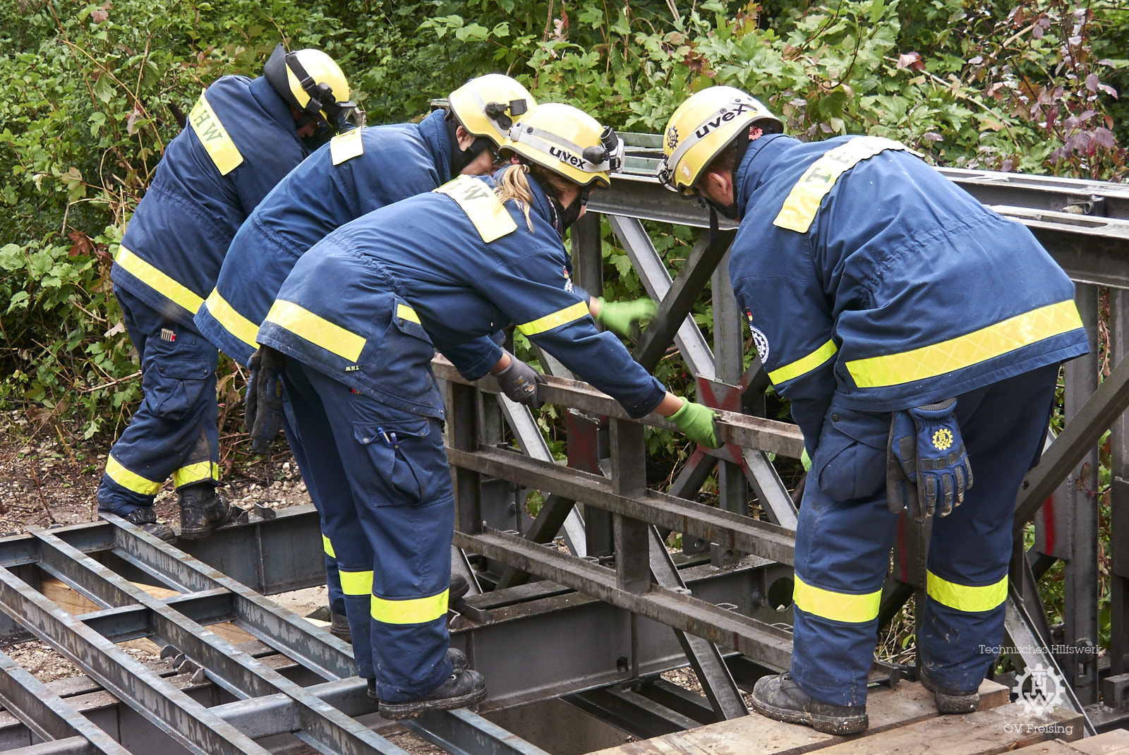 12,25 Meter lang, rund 13 Tonnen schwer und bis 30 Tonnen belastbar – das sind die Daten einer Behelfsbrücke, die 17 THW-Einsatzkräfte der Fachgruppe Brückenbau des Ortsverbandes Freising und des Ortsverbandes München-Land am vergangenen Samstag errichteten.