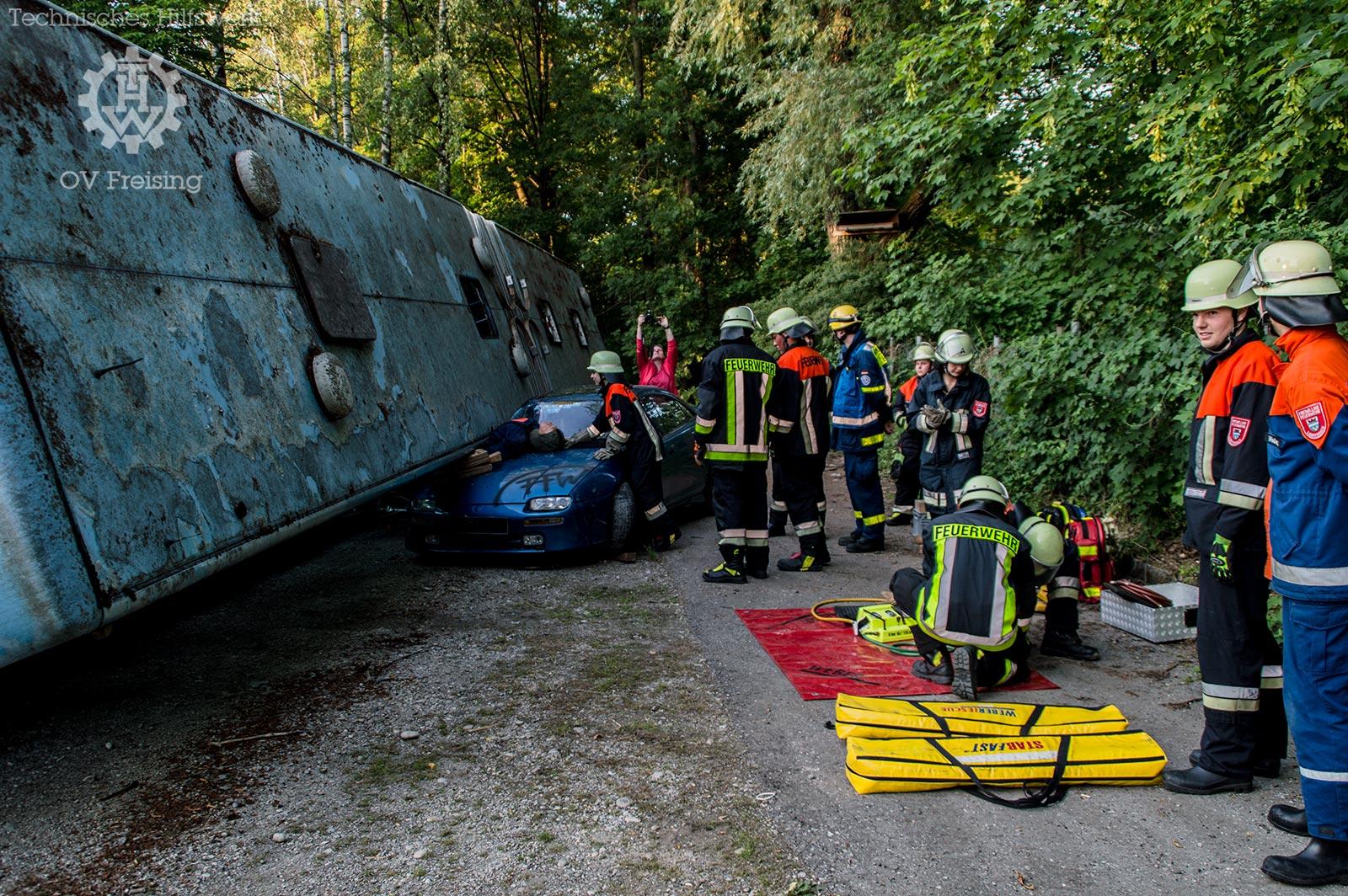 Bei der ersten so genannten Lage war ein Linienbus umgekippt, auf ein Auto gestürzt und hatte darunter einen Fahrradfahrer begraben. Die Schwierigkeit bestand nun darin, zu verhindern, dass der Bus beim Anheben zurück kippt und weitere Personen oder sogar Helfer unter sich begräbt. Die Feuerwehr sicherte den Bus mit Hilfe des Stab-Fast-Systems gegen Kippen. Wie im echten Einsatzgeschehen auch, kam der Fachberater des THW hinzu und unterstützte die Feuerwehr mit Wissen und im Laufe der Übung auch mit weiteren THW-Kräften, dem MzKW und dem GKW 1. So wurde der Bus von den THW-Kräften unterbaut, mittels Büffelwinden angehoben und von der Feuerwehr unter Einsatz eines Greifzugs gegen Umkippen gesichert. Als der Bus weit genug angehoben war, wurde der verletzte Fahrradfahrer mit Hilfe eines Spineboards aus dem Gefahrenbereich gerettet und dem fiktiven Rettungsdienst übergeben. Bei diesem Szenario klappte die Zusammenarbeit und das Untereinander der Kräfte auf Anhieb einwandfrei.