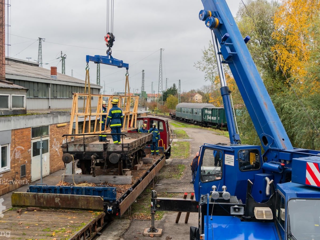 Der Bayerische Localbahnverein hat es sich zur Aufgabe gemacht, alte Lokomotiven und Waggons betriebsfähig herzurichten und damit die Erinnerung an die „gute, alte Eisenbahn“ und ihre technischen Meisterwerke am Leben zu erhalten. Viele rührige Eisenbahnenthusiasten investieren einen Großteil ihrer Freizeit für die Instandsetzung dieser Ikonen der Industrialisierung und des Transportwesens. Nun aber brauchten Sie dringend Hilfe in ihrer Arbeit. Eigentlich lautete die Bitte, einen runderneuerten Damplokkessel der Baureihe 70 auf den Rahmen der Dampflok zu heben. Da dieser jedoch wohl nicht mehr reparabel war sondern neu gebaut wird, verzögert sich diese Hilfeleistung wohl bis Pfingsten 2020. Trotzdem war das dringend notwendige Umheben eines alten Güterwaggons notwendig, dass eigentlich im Zuge des Kesseleinhebens hätte erledigt werden sollen.