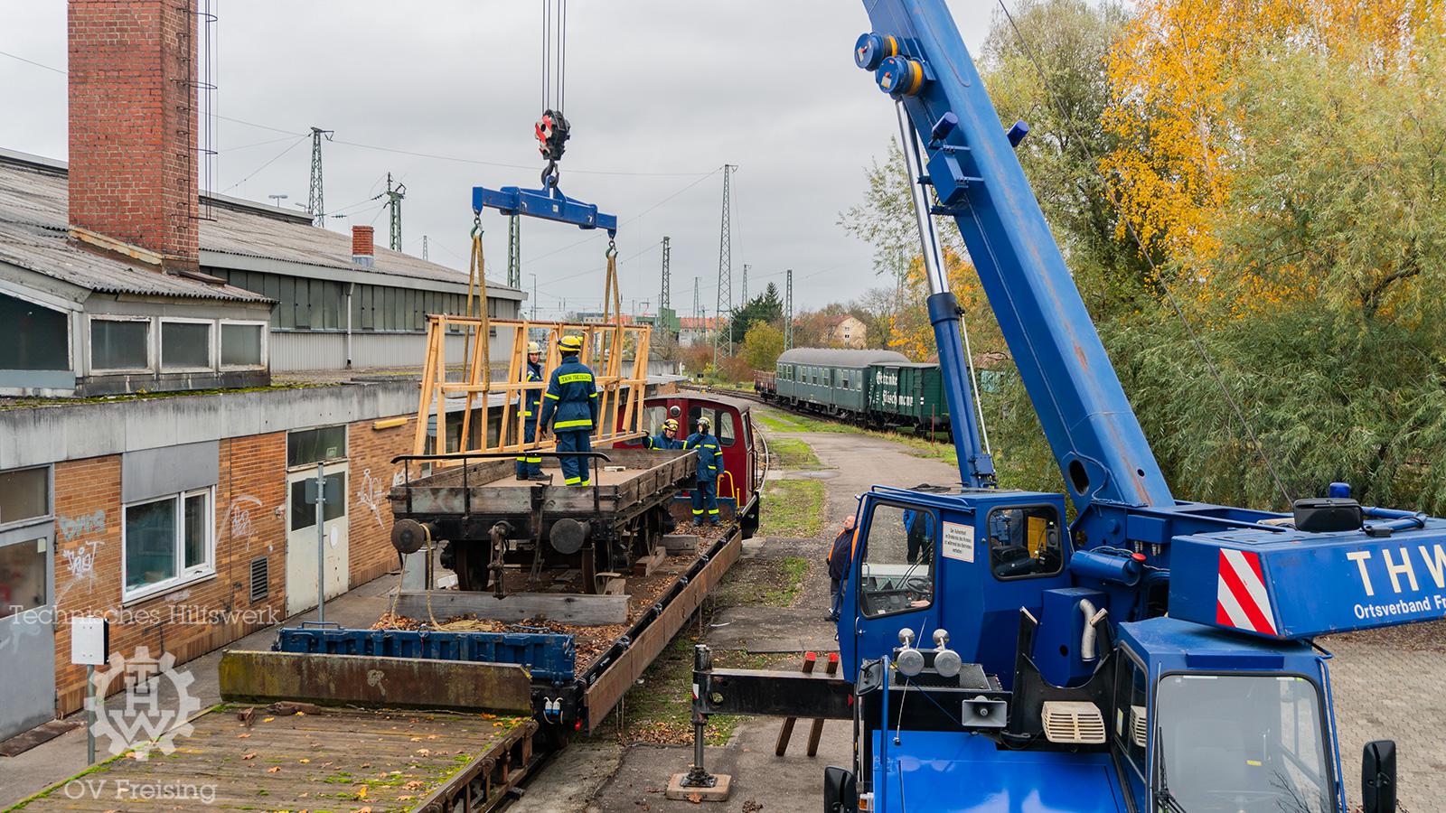 Am vergangenen Samstag rückten deshalb der Mobilkran des THW Freising zusammen mit dem Gerätekraftwagen I (GKW-I) und einer Gruppe ehrenamtlicher Einsatzkräfte vor allem aus der Bergungsgruppe nach Landshut aus, um einen Güterwaggon aus der Zeit der Königlich Bayerischen Staatseisenbahnen (K.Bay.Sts.B.) von einem Güterwaggon zu heben. Der Anhänger, der deutlich älter als 100 Jahre ist und gut 5,5 to. wiegt wurde nach einer gründlichen Überprüfung mit Ketten an den Puffern an der Traverse des Mobilkrans befestigt und vorsichtig vom Transportwaggon gehoben. Dazu musste zunächst das Schutzdach über dem Anhänger demontiert werden. Eine kleine Rangierlok des Vereins zog dann unter dem schwebenden Anhänger den Transportwaggon weg und einen vereinseigenen unter den Anhänger. Danach wurde dieser wieder millimetergenau auf den Lagerböcken auf dem zweiten Anhänger abgesetzt und das Schutzdach neu positioniert und montiert.