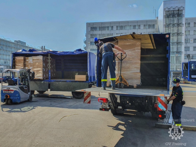 Seit Einsatzbeginn 16.03.20 haben die bisher kumulativ eingesetzten 575 Freisinger THW-Kräfte an bisher 58 Einsatztagen mit täglich vorrangig fünf Einsatzfahrzeugen (2 Kombis, 3 LKW mit Ladebordwand) insgesamt 392.582 Teile aus 30 unterschiedlichen Produkten mit 588 Auslieferungen an 151 bevorrechtigte Empfänger im Landkreis ausgeliefert. Parallel wurden vom THW für den Landkreis Freising insgesamt 992.487 Teile aus 87 Lieferungen bzw. Abholungen angenommen (62 Abholungen durch das THW Freising, vor allem aus dem Bayerischen Auslieferlager des LGL) und kommissioniert. Weiteste Abholung waren Schutzkittel für Mitarbeiter in Krankenhäusern und Pflegeheimen vom Flughafen Frankfurt und OP Mund-/Naseschutz aus Limburg a. d. Lahn. Beide Abholungen erfolgten in Zusammenarbeit mit dem THW OV Obernburg im Rendezvous-Verfahren, d. h. die Waren wurden auf der Hälfte der Strecke umgeladen und heimtransportiert. Aus Sicherheitsgründen erfolgten diese Umladungen unter Polizeischutz. Insgesamt wurden bis heute 55 Einsatzaufträge der THW-Regionalstelle München zusätzlich abgearbeitet. Im Corona-Einsatz legten die 13 bisher eingesetzten Fahrzeuge des THW Freising insgesamt seit 16.03. bis heute 14.092 km zurück!