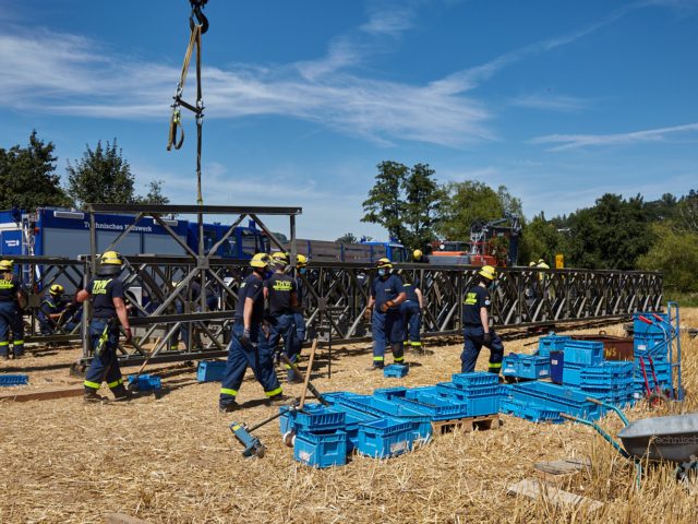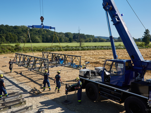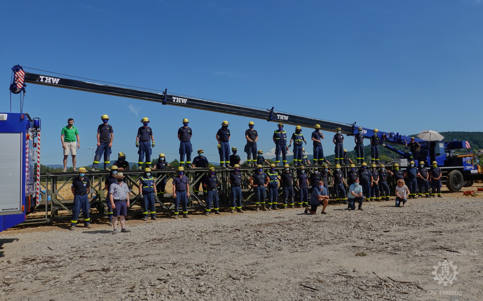 Nachdem die Freisinger Brückenbau-Spezialisten am Freitag, den 31. Juli bereits die so genannte Montagebahn eingerichtet hatten, montierten am Samstag, den 1. August, rund 50 Einsatzkräfte der THW-Ortsverbände Cham, Roding und Freising die rund 35 Tonnen schwere Stahlkonstruktion der Behelfsbrücke aus bis zu 300 kg schweren Bauteilen. Bei Temperaturen von über 30°C und der Notwendigkeit, Mund-Nasen-Schutz zu tragen, stellten die Arbeiten auf der praktisch schattenlosen und staubigen Montagefläche als körperlich extrem belastend für die THW-Kräfte heraus. Dank der hervorragenden Zusammenarbeit der beteilgten Ortsverbände, ausreichend Getränken und der Möglichkeit zu regelmäßigen Pausen konnten die Arbeiten aber trotzdem plangerecht im Lauf des Nachmittags abgeschlossen werden. Ein Bad im Regen sorgte im Anschluss noch für eine verdiente und willkommene Abkühlung.