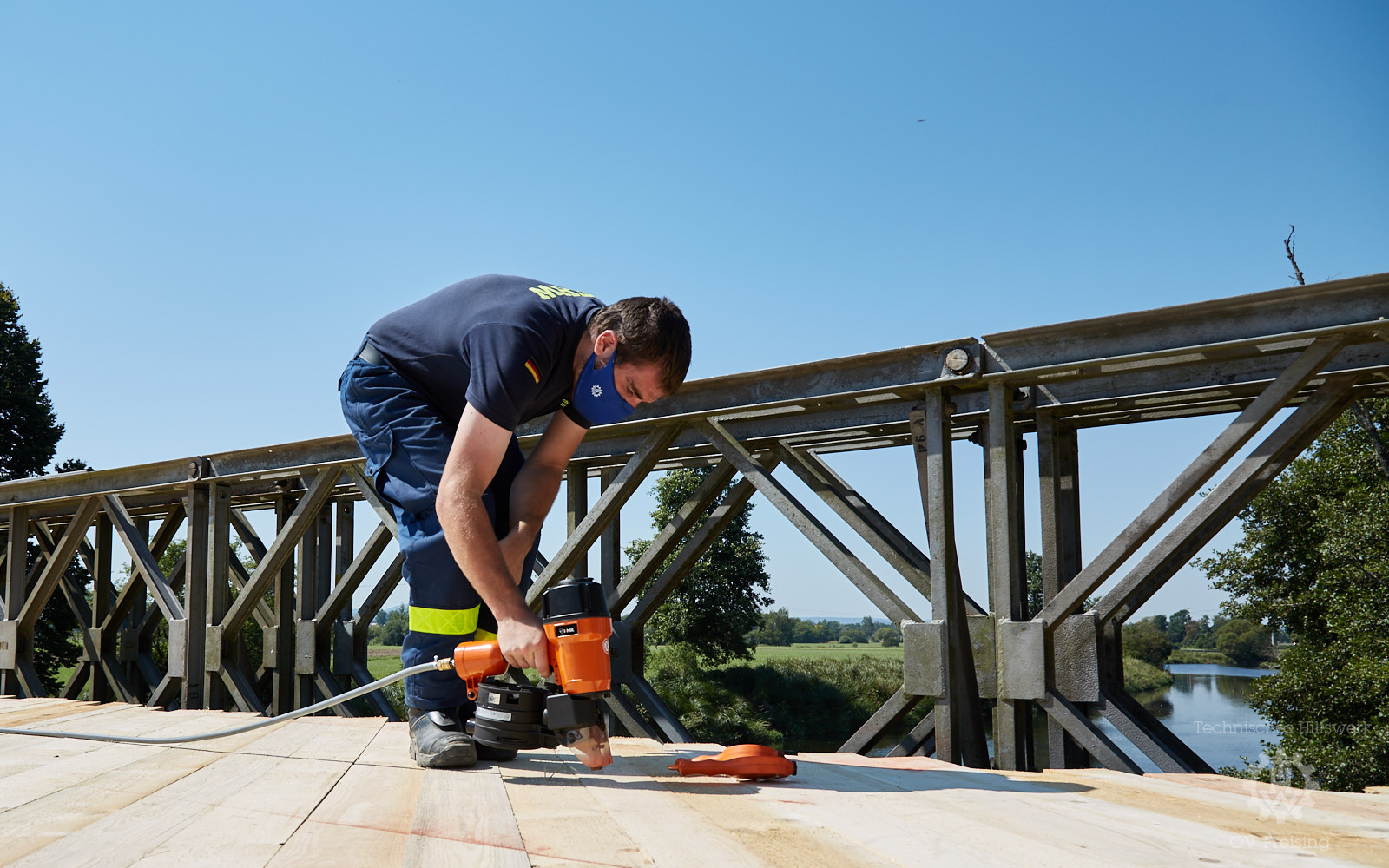 Die Kollegen aus Cham schalteten daraufhin die Freisinger Fachgruppe Brückenbau ein. Nach einer Besichtigung vor Ort und einigen Planungen konnte Gruppenführer Florian Wigger der Stadt Cham eine Bailey-Behelfsbrücke für den Fußgänger- und Radverkehr mit einer Stützweite von 36,65 m vorschlagen.