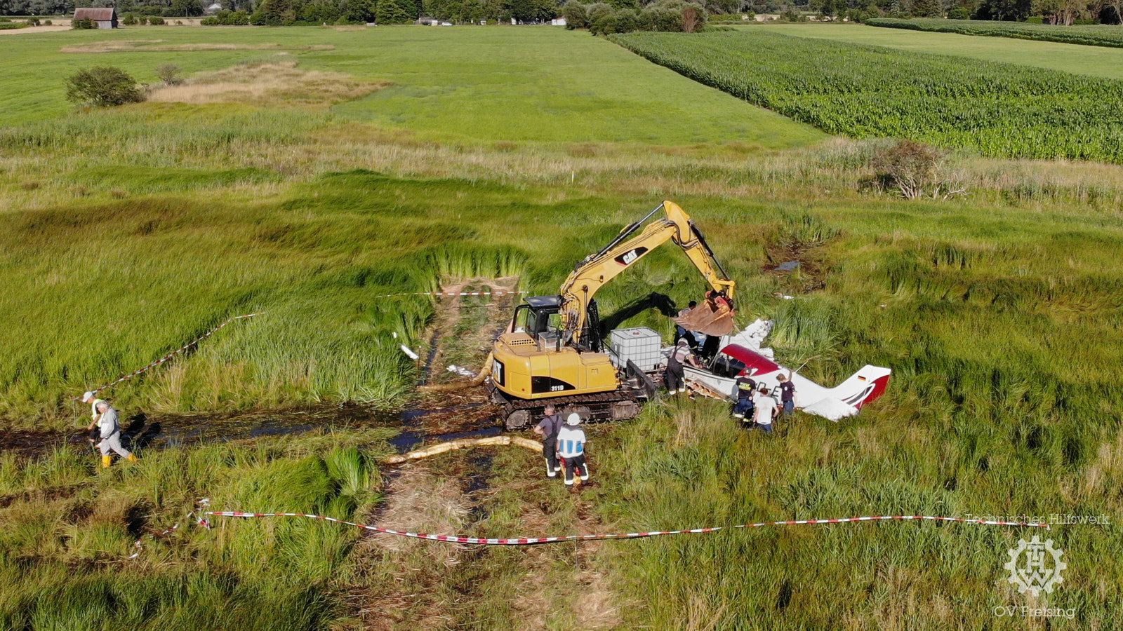 Nachdem die Verletzten von Feuerwehr und Rettungsdienst versorgt und in umliegende Krankehäuser transportiert waren, wurde das THW Freising zur Bergung der Maschine alarmiert. Dazu wurde in Abstimmung mit dem Unfallermittler der Bundesstelle für Flugunfalluntersuchung (BFU) von den rund 25 THW-Kräften zunächst der noch in den Tanks verbliebene Kraftstoff in einen Behälter abgelassen. Anschließend mussten noch der Motorbereich und die Tragflächen vom Rumpf getrennt werden.