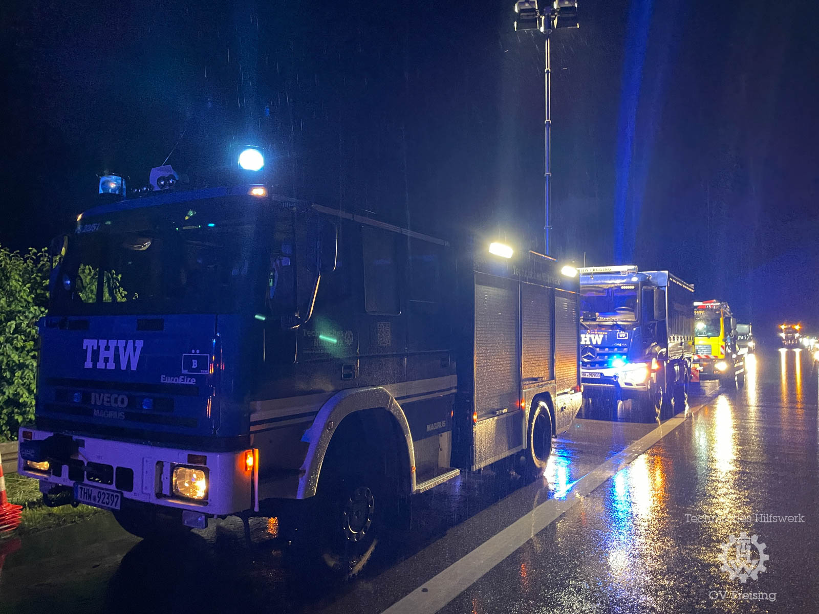 Vor Ort wurde die Einsatzstelle vom Gerätekraftwagen ausgeleuchtet und die Ladung wurde mit einer Menschenkette in einen LKW mit Ladebordwand umgeladen.