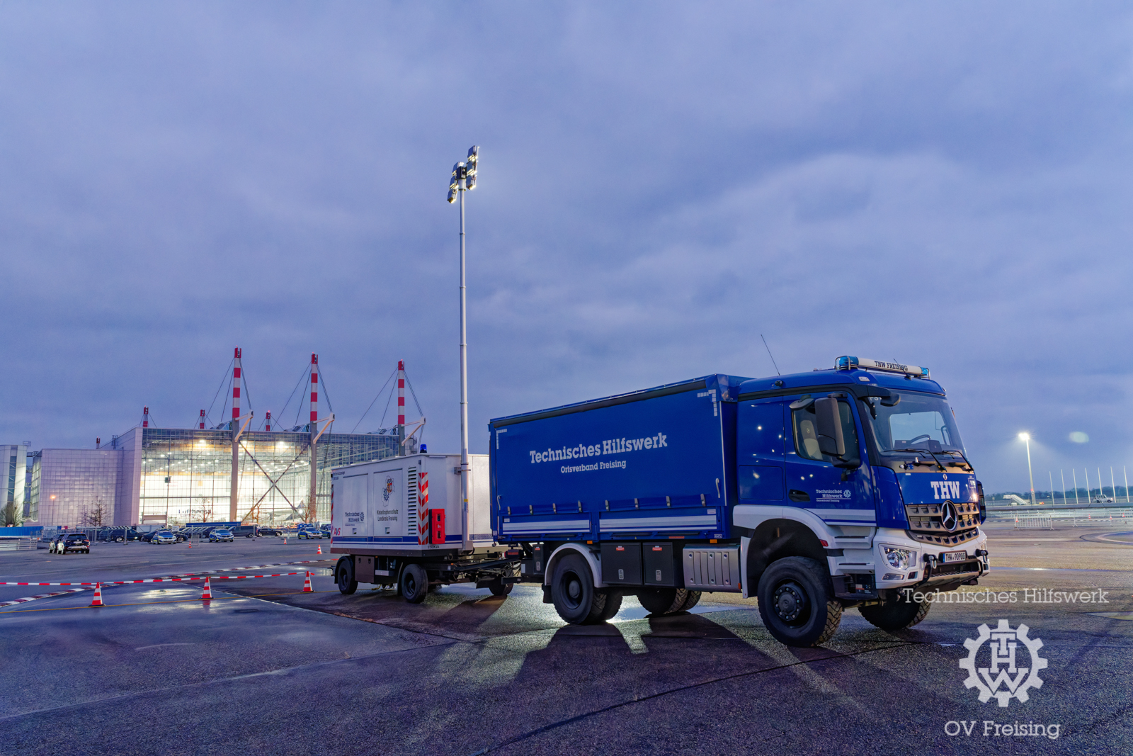 Für die internationalen Gäste ist das THW Freising mit den zahlreichen Fahrzeugen und den hell erleuchteten Flächen im Anflug auf München bereits sichtbar. Das sensible Umfeld, der uneingeschränkte Betrieb des Großflughafens und der stark frequentierte Luftraum sind gleichzeitig eine besondere Herausforderung. Abgestimmte Beleuchtungskonzepte mit Redundanzen zur Ausfallsicherung waren auch 2025 gefragt.