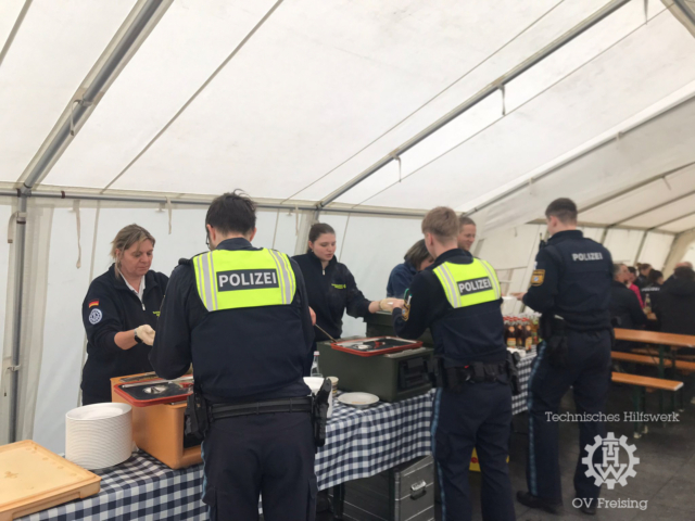 Neuer Schwerpunkt war dieses Jahr die Übernahme der Verpflegung der Polizeikräfte. Aus Sicht der Betroffen mindestens so sicherheitsrelevant wie die Beleuchtung. 350 warme Malzeiten mussten täglich von 15 ehrenamtlichen Helferinnen und Helfern während der MSC bereitgestellt werden. Auch für eine Organisation des Katastrophenschutzes eine operative Herausforderung. Umfangreiche Vorbereitungen, kochen im Schichtbetrieb und die Betreuung mehrerer Ausgabestellen forderten die Küchenmannschaft des Ortsverbandes. Die Rückmeldungen der zahlreichen Gäste zeigten aber auch direkt den Erfolg und die Wertschätzung der Anstrengungen.