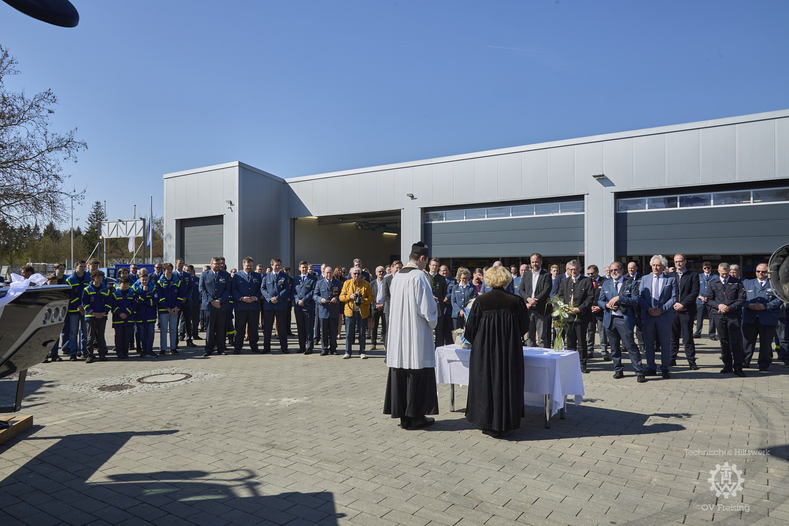 Aus der Blaulichtfamilie konnte Ortsbeauftragter Michael Wüst die Leiter der Polizeiinspektionen im Landkreis, Vertreter des Bayerischen Roten Kreuzes und des Malteser Hilfsdiensts ebenso begrüßen wie den Kommandanten der Freiwilligen Feuerwehr Freising, Oliver Sturde mit seinem Vizekommandanten Christan Schaeffler. Von der Flughafen München GmbH, die dem Ortsverband einen Wechsellader überlassen hatte, war der Leiter der Konzernsicherheit, Lothar Fruehsammer mit dem Leiter Brandschutz, Claudius Blank und dem stv. Leiter der Werkfeuerwehr Florian Klein gekommen. Der stv. Vorsitzende der im Landkreis ansässigen Hilfsorganisation NAVIS e. V., Dr. Thomas Geiner und der technische Leiter Max Kriebel – zwar formal ohne Blaulicht, aber trotzdem Part der Blaulichtfamilie – waren ebenfalls dabei.