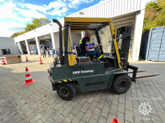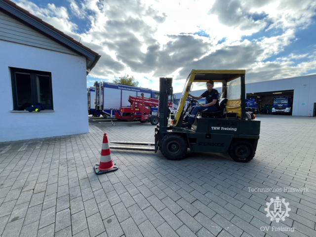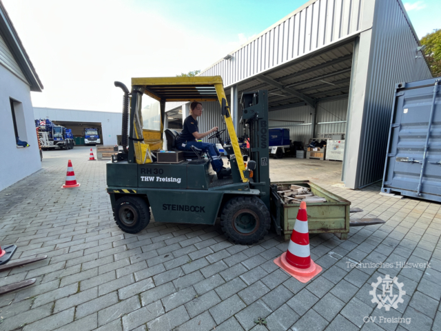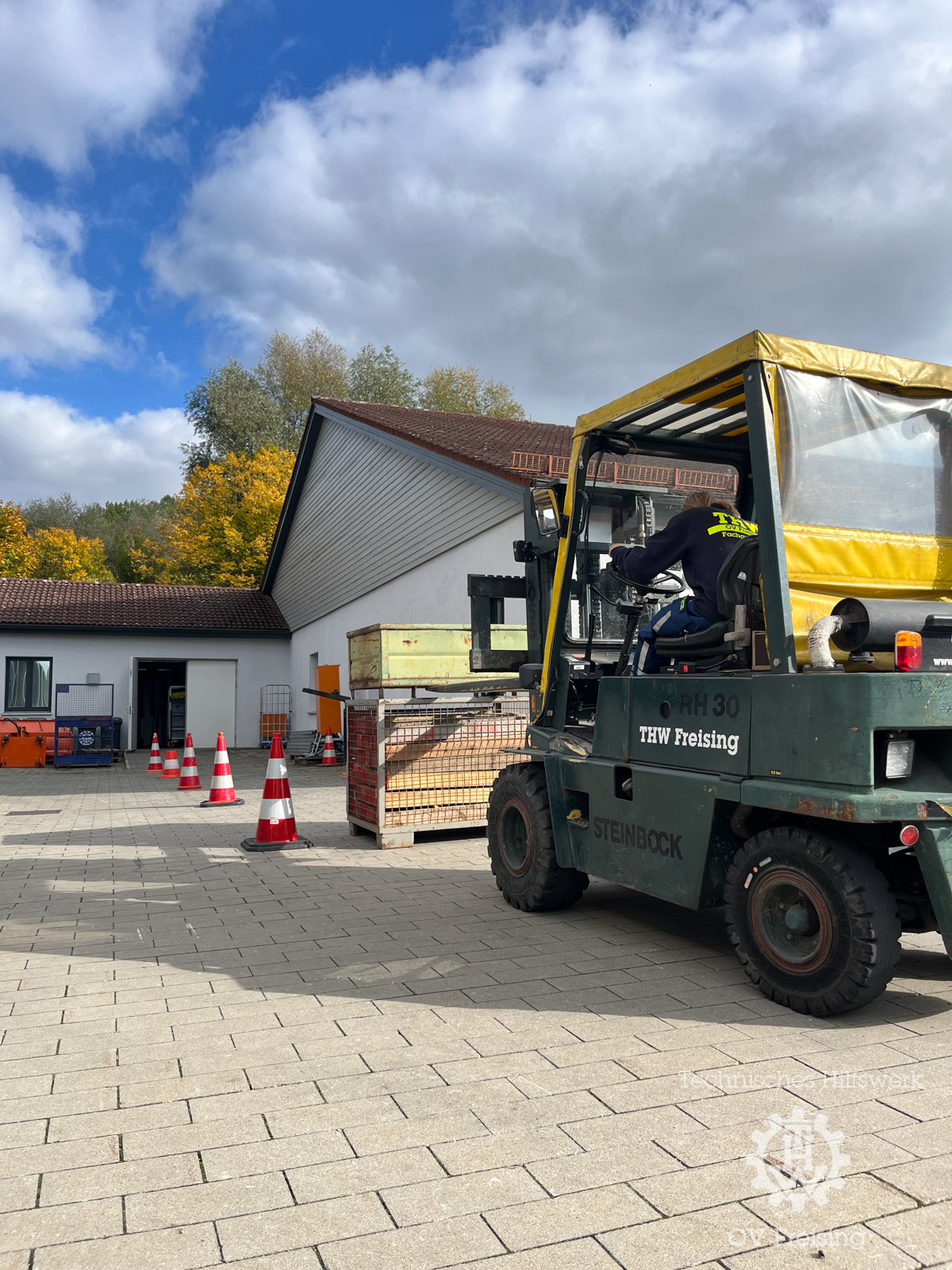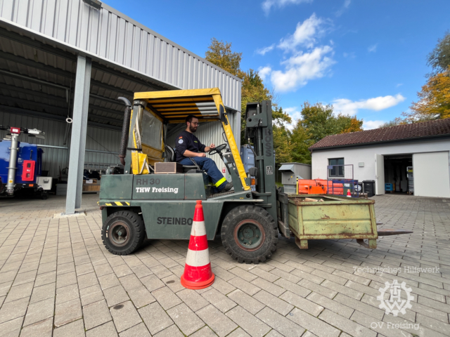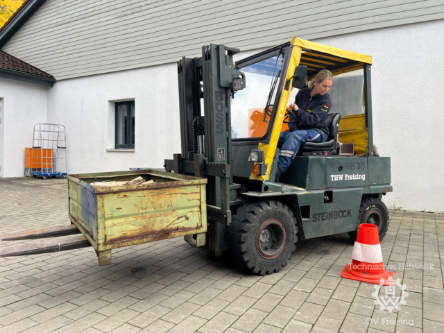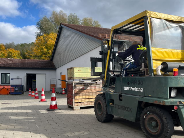 Der sichere Umgang mit Gabelstaplern ist für das THW Freising von großer Bedeutung. Je nach Einsatzszenario müssen Fahrzeuge oder Anhänger effizient und sicher beladen werden. Teile der Ausstattung lagern in Hochregalen und auch schwere Komponenten wie das Abstütz-System-Holz (ASH) oder Elemente der Bailey-Brücke lassen sich nur mit Flurförderzeugen bewegen – eine manuelle Verladung ist hier nicht möglich.