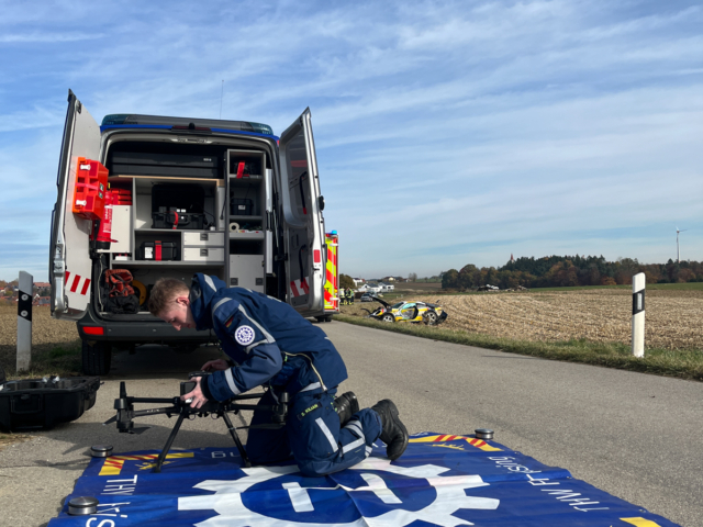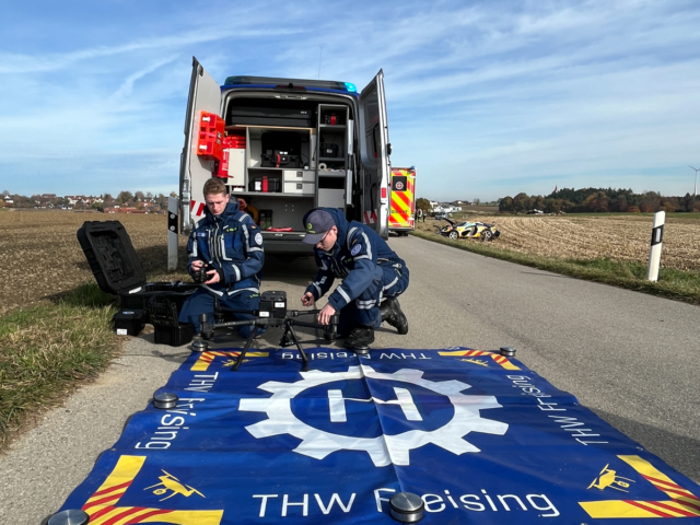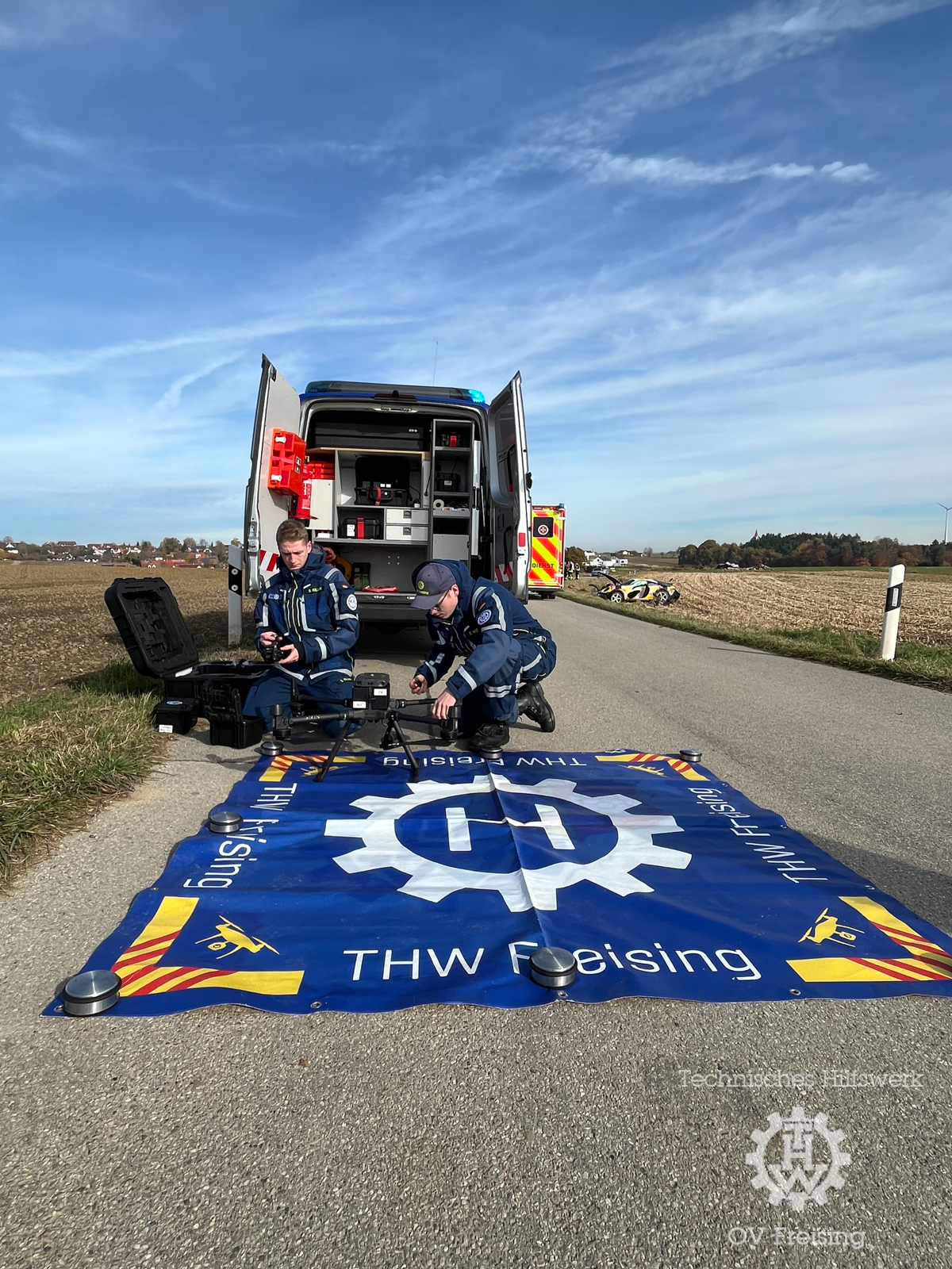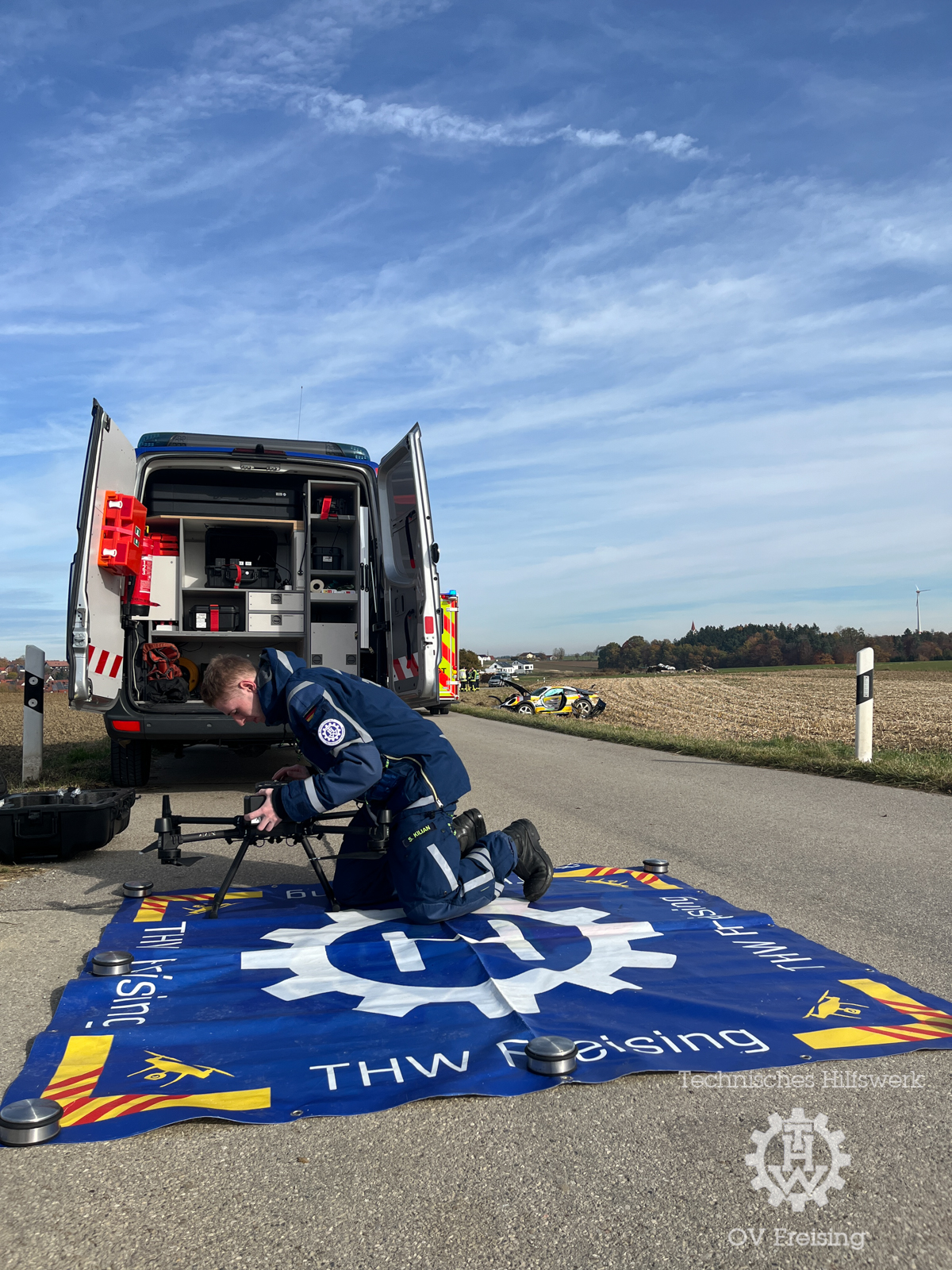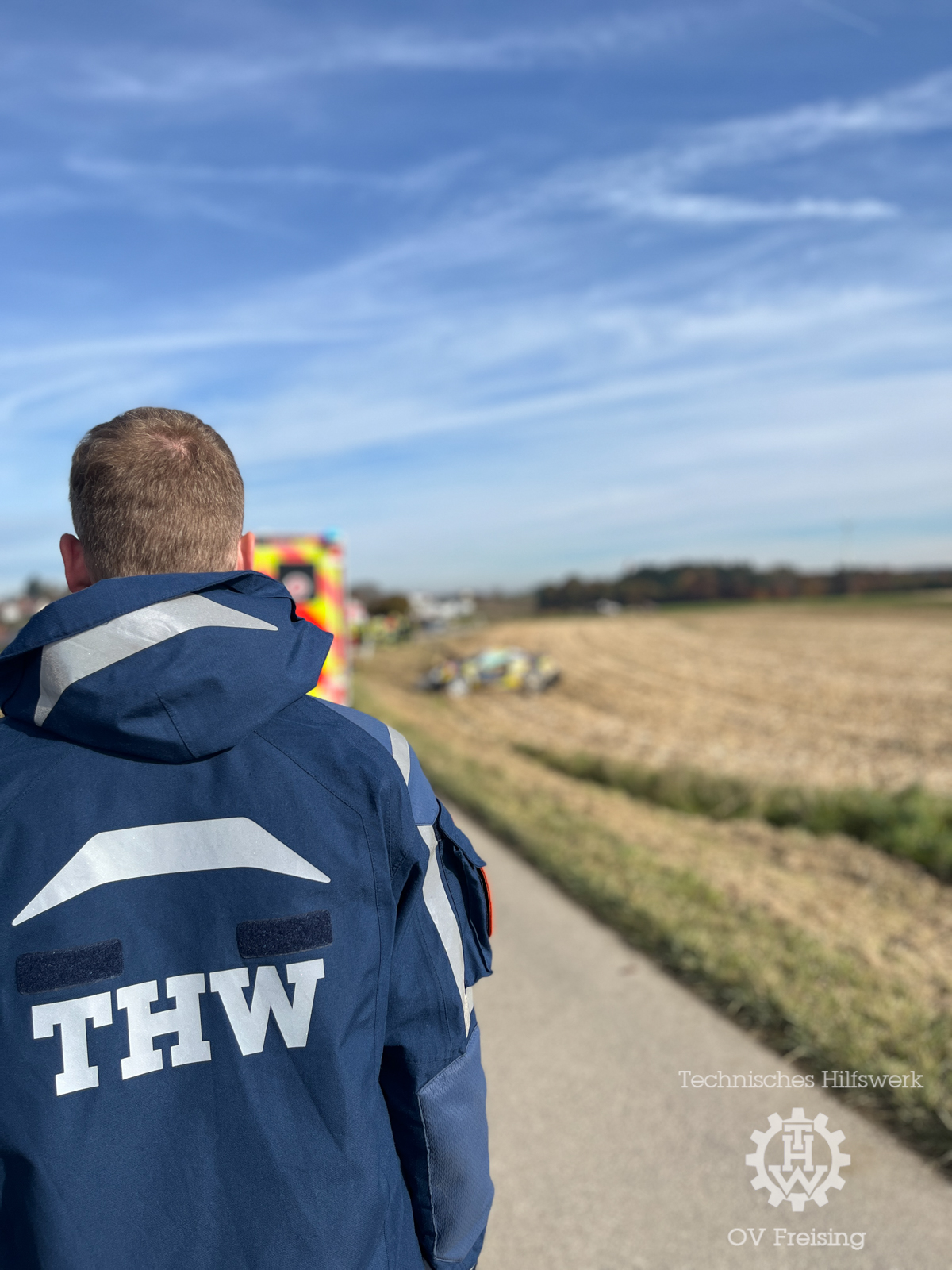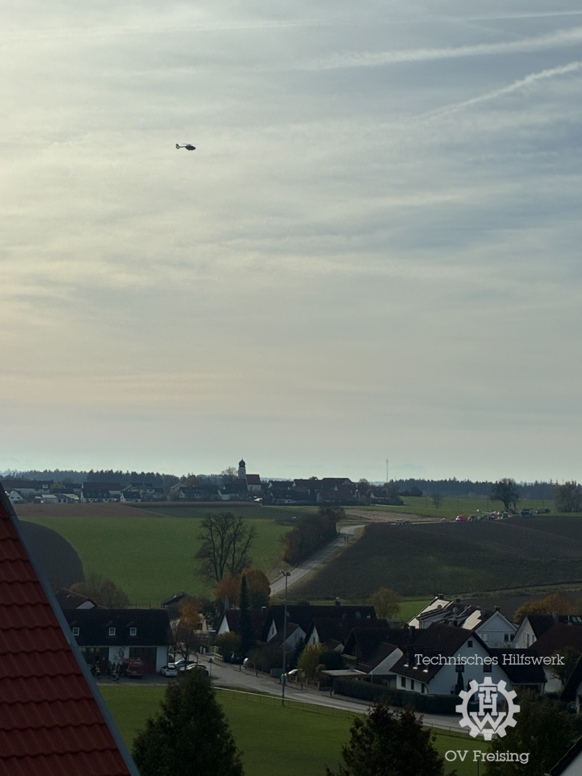 01.11.2025 – Samstag Vormittag ereignete sich zwischen Paunzhausen und Walterskirchen ein Verkehrsunfall, bei dem ein Fahrzeuge alleinbeteiligt von der Straße abkam und sich in einem anschließenden Feld mehrfach überschlug. Durch den ausgelösten eCall des Fahrzeugs wurden die Feuerwehren Aiterbach, Allershausen, Ilmmünster, Paunzhausen, und Schlipps alarmiert. Vor Ort wurde der verletzte Beifahrer angetroffen und versorgt. Der Fahrer des Fahrzeugs hatte sich von der Unfallstelle entfernt. Um ihn zu suchen wurden die Drohnengruppe des Landkreises und der Trupp UL des THW Freising alarmiert.