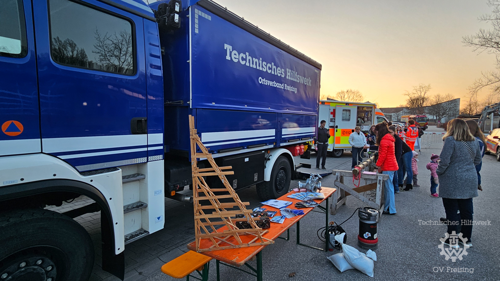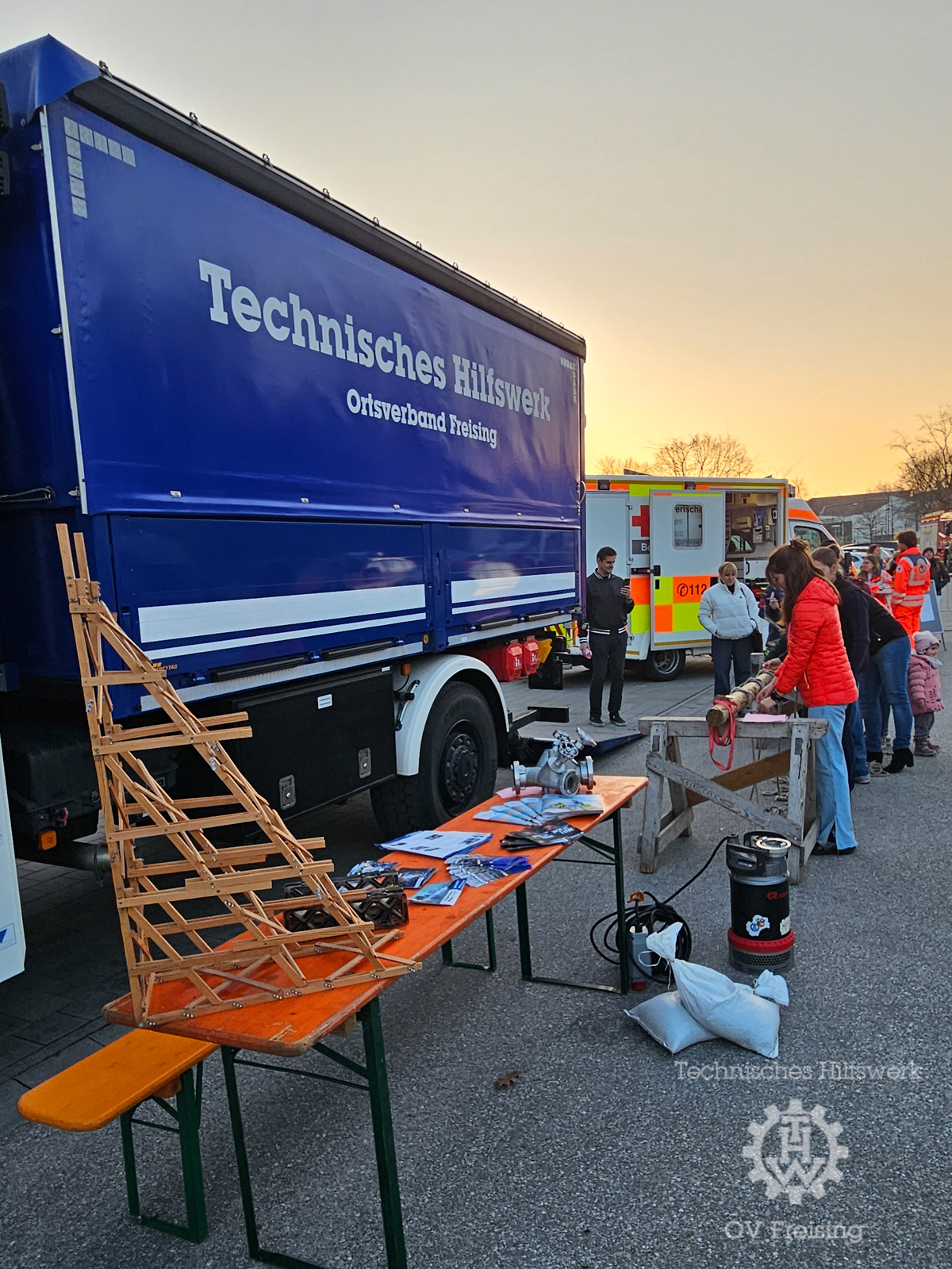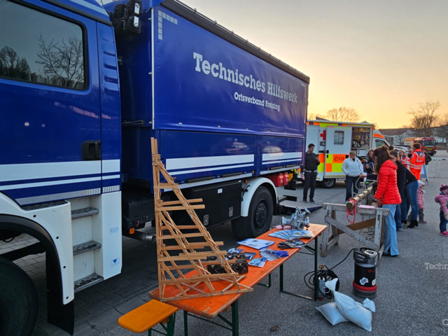 Das THW präsentierte zusätzlich ein Modell des Abstützsystems Holz (ASH) sowie weitere Ausrüstungsgegenstände, die bei Einsätzen zum Einsatz kommen. Die Besucherinnen und Besucher konnten die Technik aus nächster Nähe erleben und Fragen zu Einsatzabläufen, Ausbildung und Mitwirkung im Ortsverband stellen.
